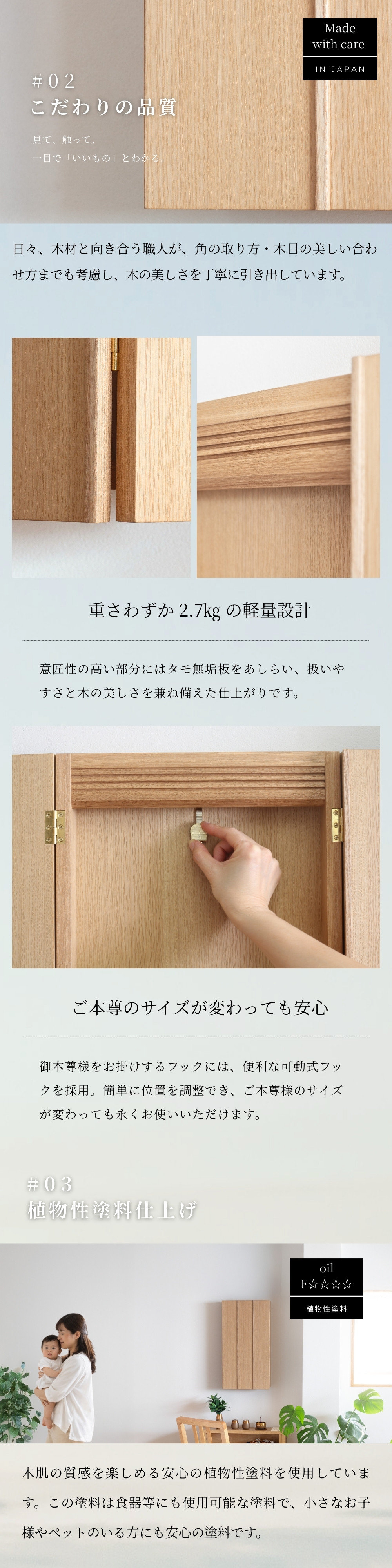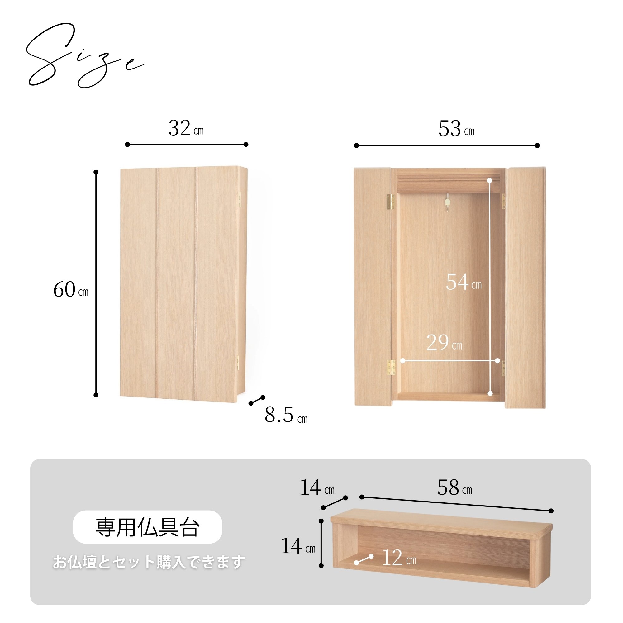 | サイズ | 本体:高60×幅32×奥8.5(cm) 厨子:高54×幅29(cm) 専用仏具台:高14×幅58×奥14(cm) |